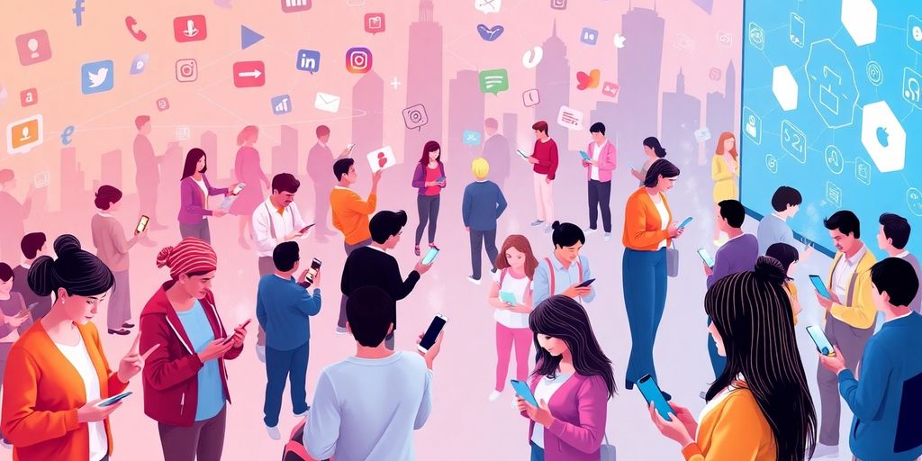 People engaging with devices in a digital social media scene.