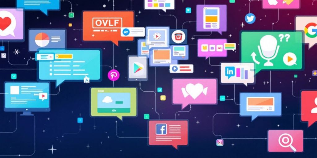 Digital landscape with computer screens and social media icons.